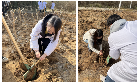活动中,在党支部书记达姣姣的带领下,同学们两两一组,挥锹铲土、扶苗培土、提水浇灌,分工合作、秩序井然,同学们干劲十足,交替接力,现场氛围热